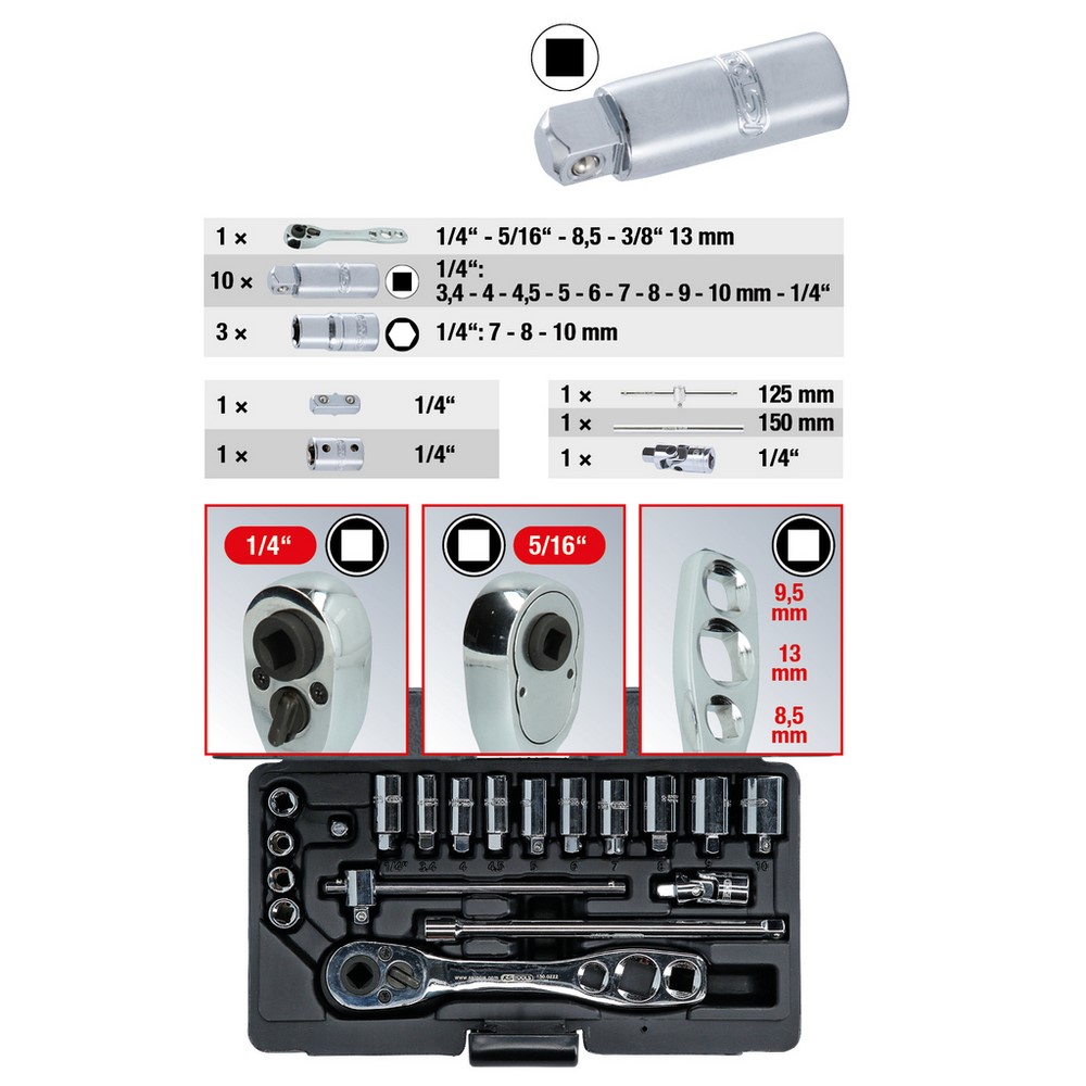 - Größen 1/4“ + 5/16“ am Ratschenkopf